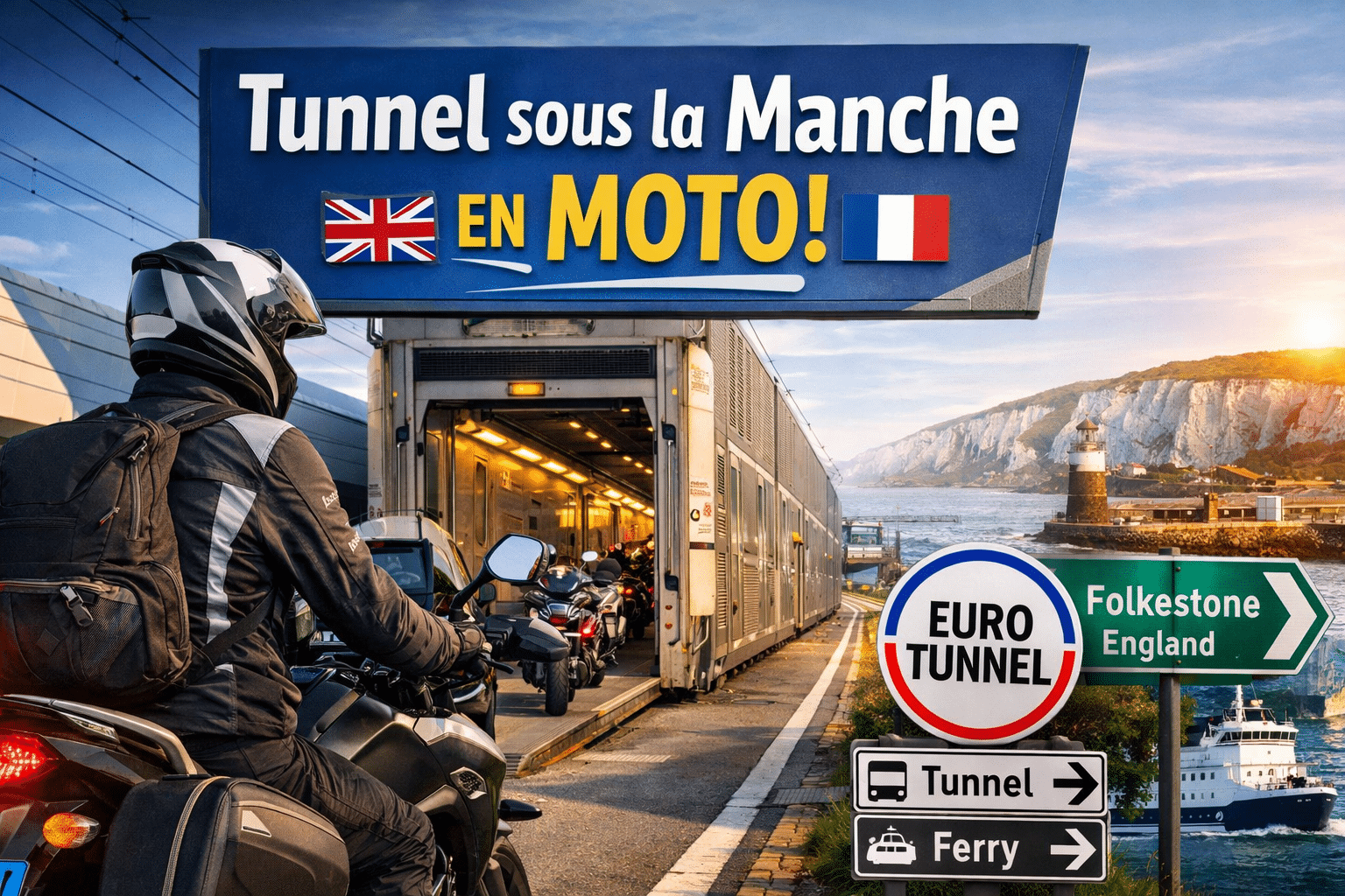 🏍️ Le tunnel sous la Manche moto se fait via LeShuttle (Eurotunnel) entre Coquelles (Calais) et Folkestone (Kent).